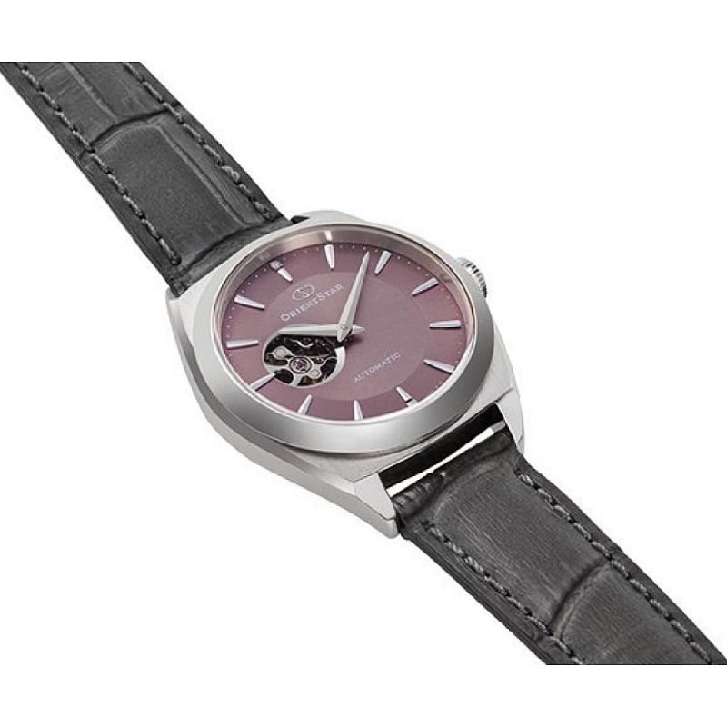 Дамски часовник Orient Star с елегантен дизайн. Корпус от неръждаема стомана. Каишка от естествена кожа. Циферблата с полускелетиран отвор на 9 часа, разкриващ движението на механизма. Сапфирено стъкло. Автоматичен механизъм Cal.55C2. Водоустойчивост 5 ATM - допускат се леки пръски и взимане на душ, не се препоръчва обилно мокрене.