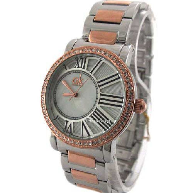 Корпус: полирана стомана, безел - цвят розово злато инкрустиран с камъни