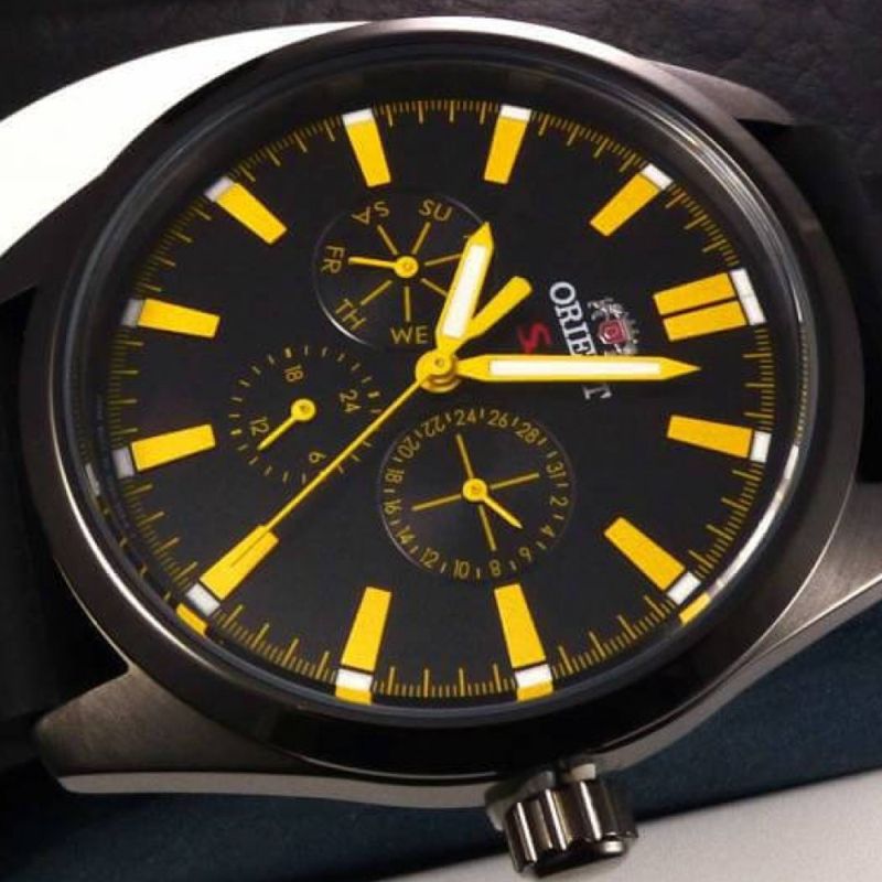 Циферблат: Черен с жълти фосфорисциращи стрелки и индекси
