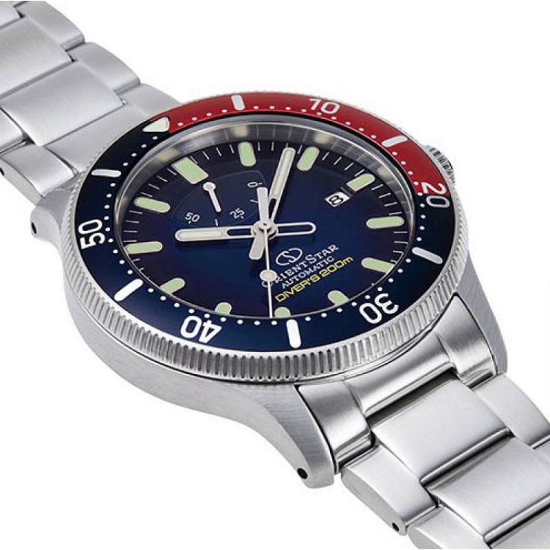 Мъжки часовник Orient Star с модерен спортнен дизайн. Моделът е с корпус и верижка от неръждаема стомана. Тъмносин аналогов дисплей с показател за дата и индикатор за резервната мощност. Фосфорисциращи стрелки и индекси. Сапфирено стъкло с антрирефлексно покритие. Задвижва се от автоматичен механизъм F6N47 с резервна мощност 50 часа. Водоустойчивост 20 ATM - позволява мокрене, къпане, плуване и гмуркане във водни басейни.