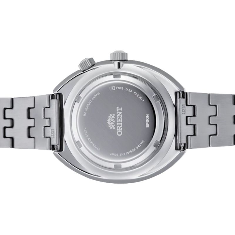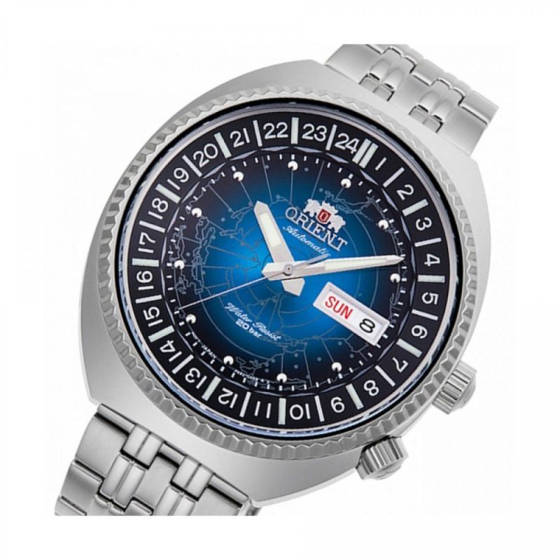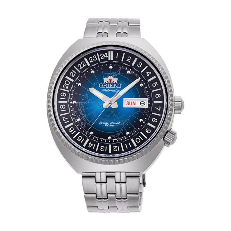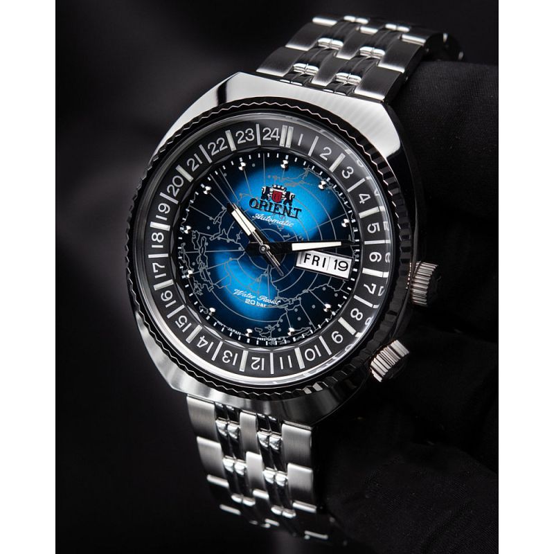 Мъжки часовник Orient от колекцията Revival, World Map. Върху циферблата е пресъзадена карта на света от 1969 г. Синият циферблат отразява Земята като небесно тяло във Вселената и е специално обрабатен, за да изглежда сферичен под стъклото. Показва час, дата и ден от седмицата. Сребристи стрелки. Часовникът има вътрешен панел, който може да се върти с помощта на короната в позиция четири часа на корпуса, което дава възможност за опростен 24-часов дисплей. Верижката е изработена от плътни метални връзки за по-добра гъвкавост и удобно прилягане. Автоматичен механизъм с калибър F6922 и енергиен резерв от около 40 часа. Водоустойчивост 20 ATM - позволява мокрене, къпане, плуване и гмуркане във водни басейни.