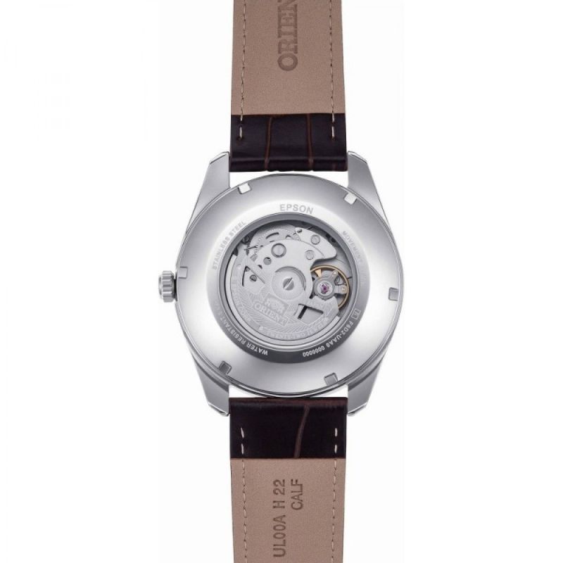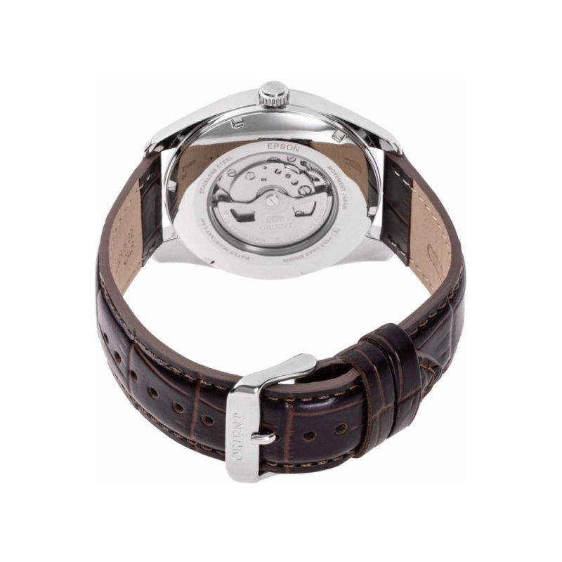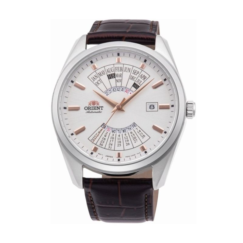 Мъжки часовник Orient Multi-year Calendar от колекция Contemporary с многогодишен календар и единствения по рода си дисплей, показващ година, месец, дата и ден. Моделът изразява креативния часовникарски стил на ORIENT, съчетавайки функционалността на механичните часовници с оригинален дизайн. Часовникът разполага с автоматична функционалност за ръчно навиване и механизъм Cal.F6D22. През прозрачния гръб на часовника, може да се наблюдава прецизното движение на механизма. Настройките на календара са значително подобрени в сравнение с предишните модели. Този модел наследява оригиналната система, която показва календара за повече от 20 години напред. Вече няма бутон за пръстена на дисплея, което означава, че всички настройки на функцията календар вече могат да бъдат изпълнени от короната. Корпусът е от неръждаема стомана и е съчетан с кафява кожена каишка. Дисплеят е в бял цвят. Водоустойчивост 5 ATM - допускат се леки пръски и взимане на душ, не се препоръчва обилно мокрене.