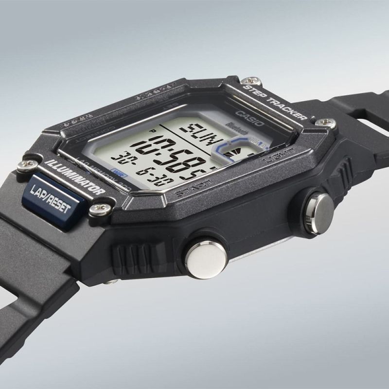 Мъжки спортен часовник Casio с корпус и каишка изработени от полимер. Моделът е с дигитален дисплей и плексигласово стъкло. Часовникът е със следните характеристики: Bluetooth 4.0 връзка, съвместим с повечето смарт телефони - програма за свързване CASIO WATCHES, крачкомер, LAP Memory 200, световно време, автоматичен календар, хронометър, обратно броене, 12/24 часов формат, 5 независими дневни аларми, led осветяване на дисплея. Задвижва се от кварцов механизъм. Водоустойчивост 10 ATM - позволява мокрене, къпане и плуване във водни басейни.