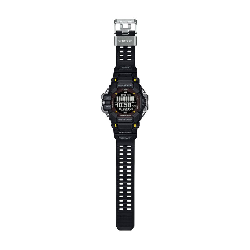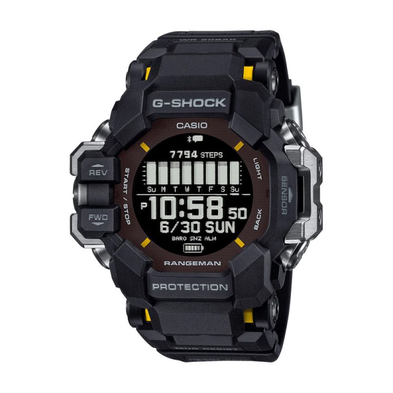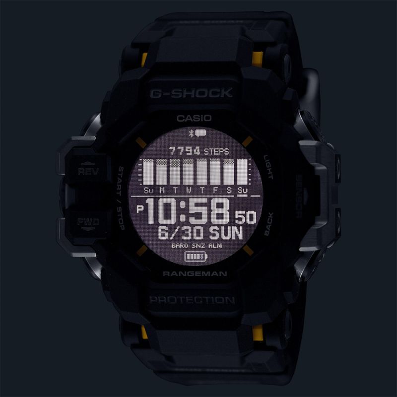 Мъжки часовник Casio G-Shock Rangeman от колекция G-SHOCK. Каишка и корпус изработени от полимер. Минерално стъкло, устойчиво към надраскване. Моделът е с подсилена конструкция, която защитава часовника от удари и вибрации. Устойчивост на ниски температури (-20° C). Соларна батерия, захранвана от слънцето. Часовникът е следните функции: индикатор показващ нивото на батерията, Airplane Function/Offline Mode ( с натискането на един бутон, часовника превключва на офлайн режим), GPS навигация, GPS Сверяване ( благодарение на хибридната си система, часовника се сверява автоматично, в която и държава да сте), Bluetooth 4.0 връзка, съвместим с повечето смарт телефони - програма за свързване CASIO WATCHES, Phone Finder, функция за тренировка( показване на разстояние, скорост, температура и други изчислени стойности въз основа на данни от GPS), измерване на сърдечната честота, анализ на тренировката, състояние на тренировка (тренд на ниво фитнес, тенденция на натоварване на тренировките, VO2MAX, време за възстановяване), данни за тренировки (до 100 писти, до 140 обиколки на бягане), изминало време, разстояние, изгорени калории, пулс, максимален пулс, ежедневно показване на данни (брой стъпки), месечно показване на данни (бягащо разстояние), показване изгрев/залез, индикатор за лунни фази, графика на приливите, дигитален компас, алтиметър, барометър, термометър, хронометър, световно време, автоматичен календар, обратно броене, 4 независими дневни аларми (и 1 със snooze функция), 12/24 часов формат, led осветяване на дисплея. Водоустойчивост 20 ATM - позволява мокрене, къпане, плуване и гмуркане във водни басейни.