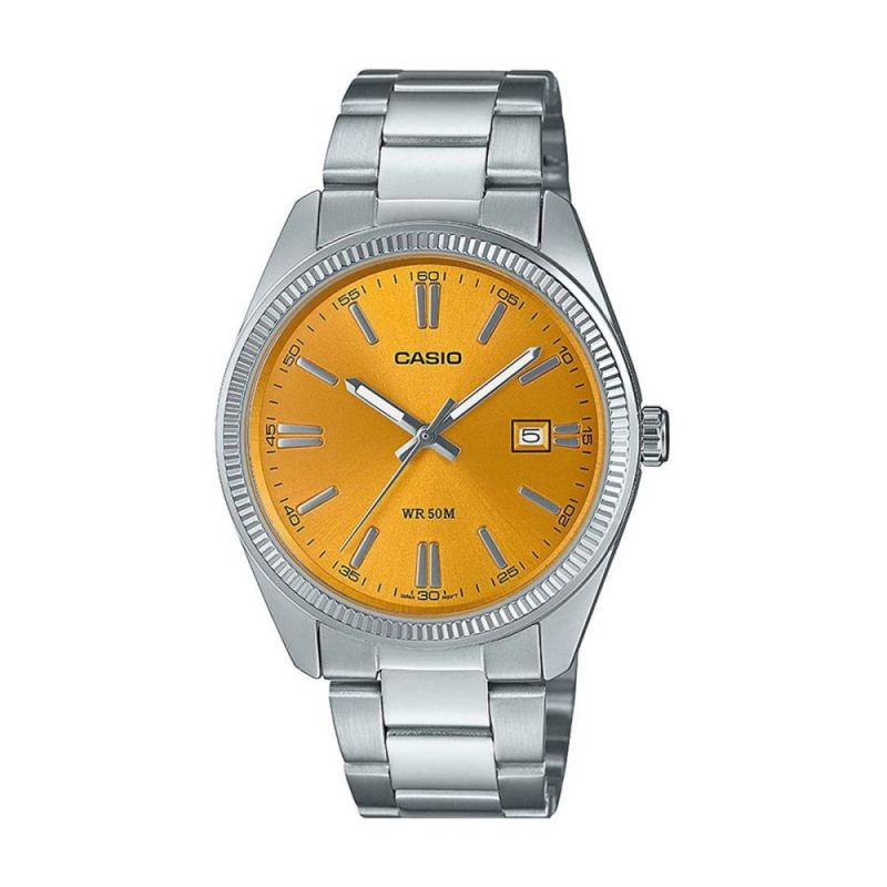 Класически модел часовник Casio със стилен дизайн. Корпус и верижка изработени от неръждаема стомана. Стъкло минерал-кристал. Аналогов дисплей в жълт цвят с показател за дата, сребристи индекси и луминeсцентно покритие на стрелките. Кварцов механизъм. Водоустойчивост 5 ATM - допускат се леки пръски и взимане на душ, не се препоръчва обилно мокрене.
