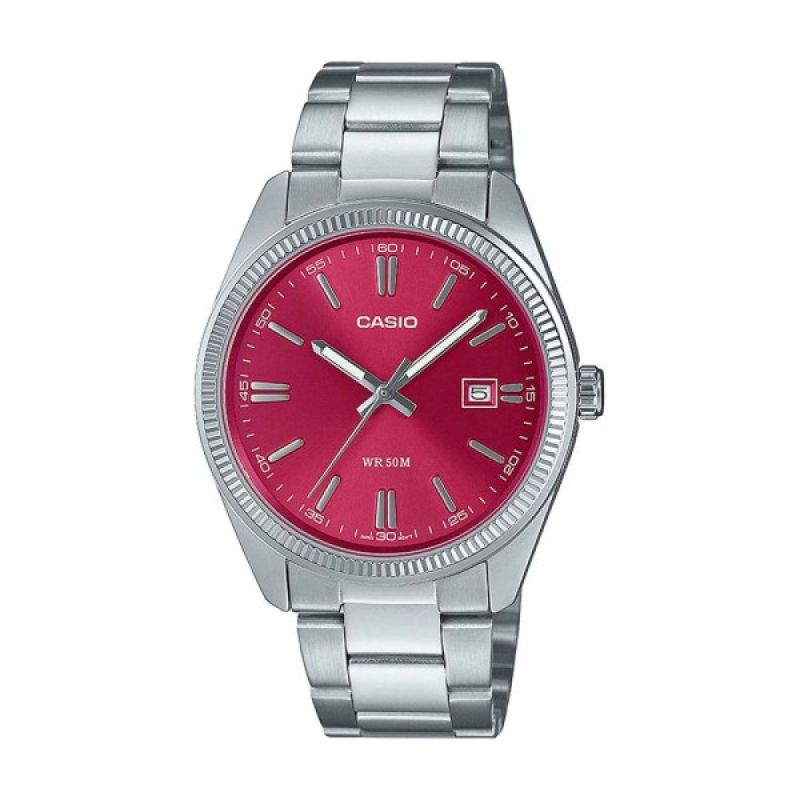 Класически модел часовник Casio със стилен дизайн. Корпус и верижка изработени от неръждаема стомана. Стъкло минерал-кристал. Червен аналогов дисплей с показател за дата, сребристи индекси и луминeсцентно покритие на стрелките. Кварцов механизъм. Водоустойчивост 5 ATM - допускат се леки пръски и взимане на душ, не се препоръчва обилно мокрене.