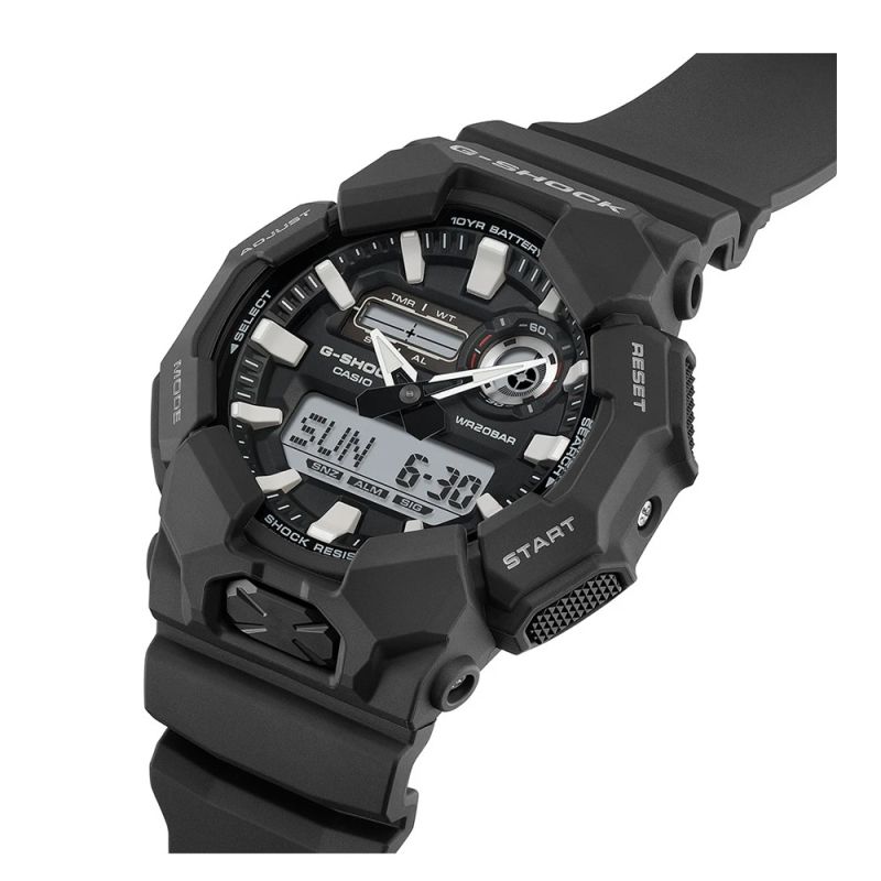 Мъжки часовник Casio GA-010-1AER от колецията G-Shock. Моделът е с корпус и каишка от полимер. Стъклото е минерал-кристал устойчиво към надраскване. Дисплеят е комбинация от аналогов и дигитален. Часовникът е със следните характеристики: световно време, автоматичен календар, хронометър, обратно броене, 12/24 часов формат, 5 дневни аларми (и 1 с snooze функция), сигнализация на кръгъл час ON/OFF, led осветяване на дисплея. Удароустойчивата конструкция защитава часовника от удари и вибрации. Задвижва се от кварцов механизъм с батерия CR2025. Водоустойчивост 20 ATM - позволява мокрене, къпане, плуване и гмуркане във водни басейни.