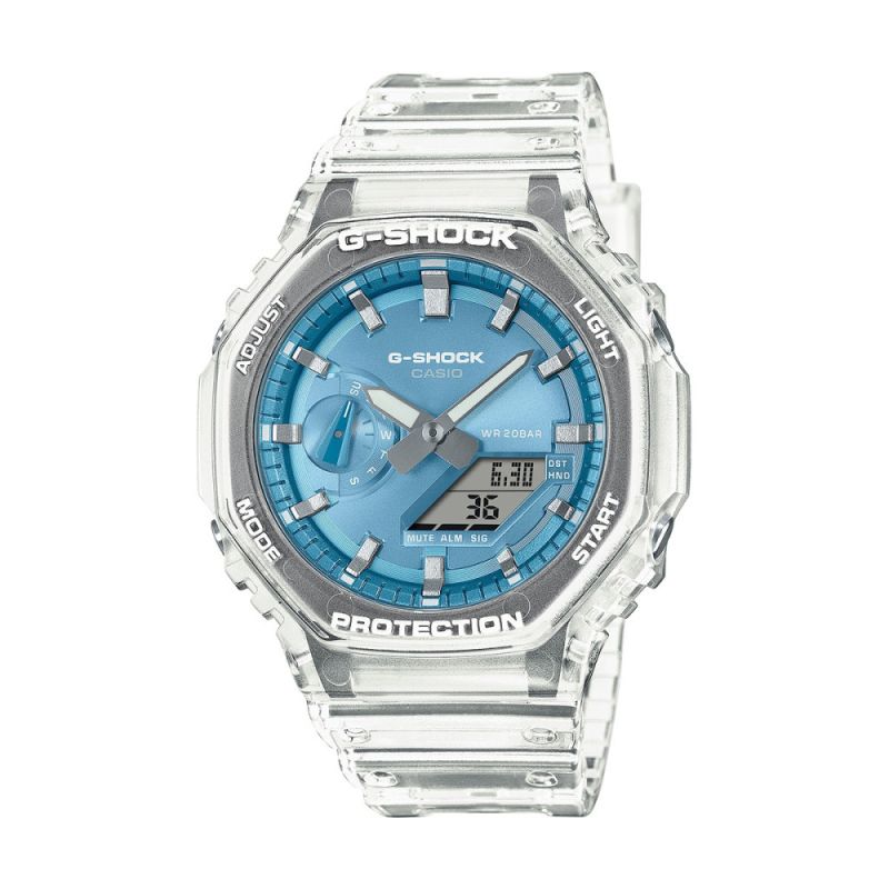 Мъжки часовник Casio от колекцията G-Shock с корпус от полимерен материал и карбон. Каишка от полимер. Стъкло минерал-кристал. Дисплей комбинация от аналогов и дигитален в небесно син цвят. Моделът има следните характеристики: удароустойчивост, световно време, автоматичен календар, хронометър, обратно броене, 12/24 часов формат, 5 дневни аларми (и 1 с snooze функция), led осветяване на дисплея. Задвижва се от кварцов механизъм. Водоустойчивост 20 ATM - позволява мокрене, къпане, плуване и гмуркане във водни басейни.