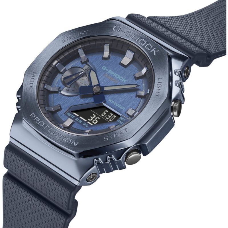 Мъжки часовник Casio със спортно-елегантен дизайн от колекцията G-Shock. Моделът е с корпус от неръждаема стомана и каишка от полимерен материал. Син аналогов дисплей с дигитални показатели и луминeсцентни стрелки. Стъкло минерал-кристал, устойчиво на надраскване. Удароустойчивата конструкция защитава часовника от удари и вибрации. Часовникът е със следните функции: световно време, автоматичен календар, хронометър, обратно броене, 12/24 часов формат, 5 независими дневни аларми, сигнализация на кръгъл час ON/OFF, led осветяване на дисплея. Задвижва се от кварцов механизъм с две батерии SR726W. Водоустойчивост 20 ATM - позволява мокрене, къпане, плуване и гмуркане във водни басейни.