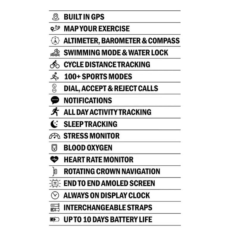 Този смарт часовник е с кръгъл корпус от сребърна йонна алуминиева сплав с 1,4-инчов, 466*466, напълно интерактивен AMOLED сензорен екран с функция за винаги включен часовник. Функциите включват брояч на крачки, вграден GPS, наблюдение на пулса и проследяване на съня. Този часовник има режим за заключване под вода и плуване; когато заключването под вода е активирано, часовникът може да се използва за плуване и леки водни спортове. Освен множество здравни функции, Active Pro може да се използва за известия за съобщения, компас и Bluetooth разговори. Часовникът се закрепва със сменяема 22-милиметрова черна силиконова каишка и има живот на батерията до 10 дни.