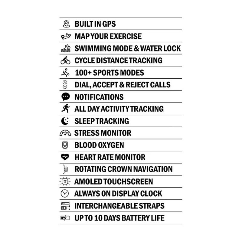 Този смарт часовник е с правоъгълен метален корпус с 1,7-инчов, 368*448, напълно интерактивен AMOLED сензорен екран с функция за винаги включен часовник. Функциите включват брояч на крачки, вграден GPS, наблюдение на пулса и проследяване на съня. Този часовник има режим за водно заключване и плуване; когато водното заключване е активирано, часовникът може да се използва за плуване и леки водни спортове. Освен множество здравни функции, Motion Pro може да се използва за известия за съобщения и Bluetooth разговори. Часовникът се закрепва със сменяема 22-милиметрова сива силиконова каишка.