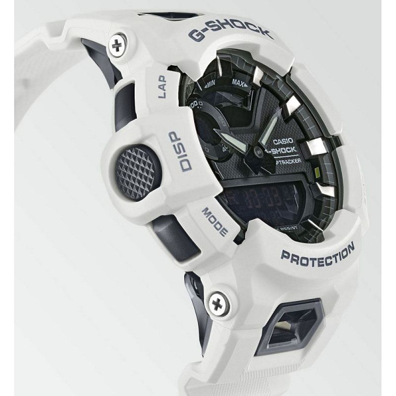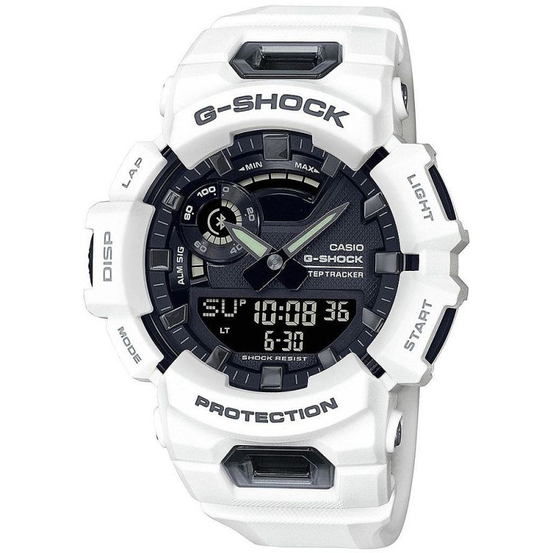 Мъжки часовник Casio от колецията G-Shock. Корпусът и каишката са от полимер. Стъклото е минерал-кристал устойчиво към надраскване. Дисплеят е аналогов с дигитален поддисплей. Часовникът се свързва със смартфон чрез Bluetooth v4.0. Моделът е съвместим с повечето смарт телефони, програма за свързване G-SHOCK MOVE App. Може да измерва разстоянието с помощта на акселерометъра, докато е свързан с GPS функцията на смартфон чрез Bluetooth. Също така можете да проверите историята на активността си. Графика с интензивност на упражненията от 5 нива и дневна степен за постигане на целите ви. Чрез синхронизацията с телефона Ви, от софтуера на смартфона можете да сверявате часа, да избирате второ време от световното време, както и да сверявате пускaте и спирате алармата и много др. Часовникът има следните характеристики: устойчив на удари, световно време, автоматичен календар, хронометър, обратно броене, 12/24 часов формат, 5 дневни аларми (и 1 с snooze функция), възможност за звуков сигнал на всеки кръгъл час, led осветяване на дисплея. Задвижва се от кварцов механизъм. Водоустойчивост 20 ATM - позволява мокрене, къпане, плуване и гмуркане във водни басейни.