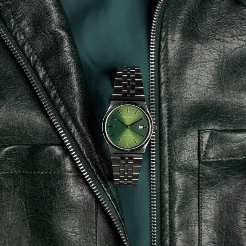 Класически модел мъжки часовник Casio с изчистен дизайн. Моделът е с корпус и верижка от неръждаема стомана. Аналогов дисплей в зелен цвят с показател за дата. Стъкло минерал-кристал. Задвижва се от кварцов механизъм. Водоустойчивост 5 ATM - допускат се леки пръски и взимане на душ, не се препоръчва обилно мокрене.