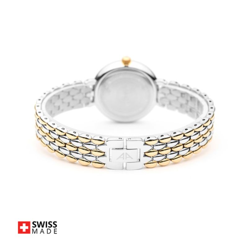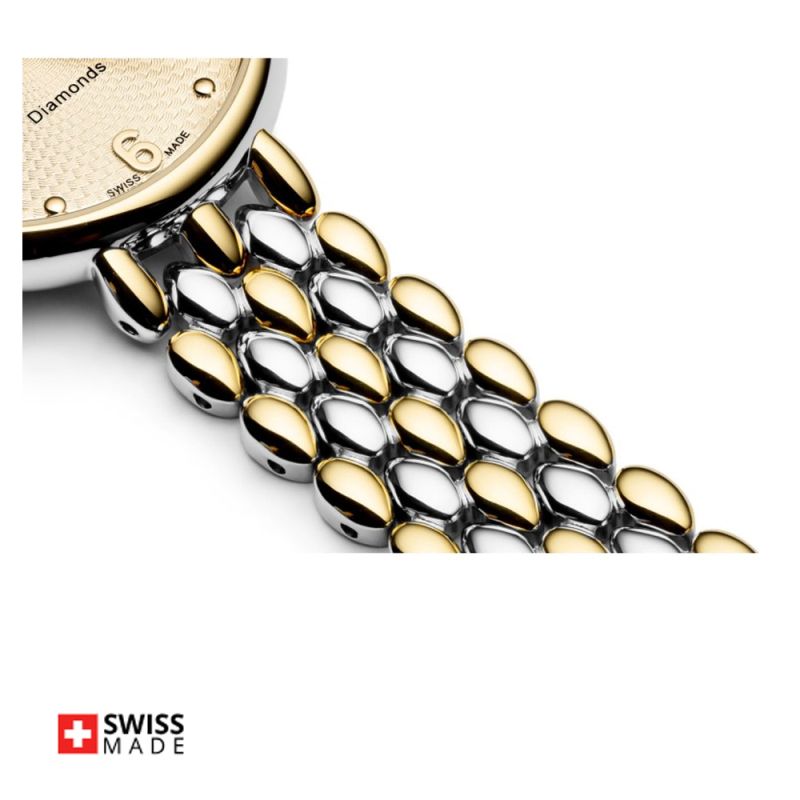Дамски часовник Appella L50014.2171DQ с елегантен дизайн. Моделът е с корпус и верижка изработени от неръждаема стомана. Циферблат в златист цвят, декориран с два диаманта и допълнен с показател за дата. Стъкло сапфир-кристал с антирефлексно покритие. Диаметър на корпуса 31 мм. Задвижва се от кварцов механизъм ETA F04 Swiss Made. Водоустойчивост 3 ATM - допускат се леки пръски, не се препоръчва обилно мокрене.