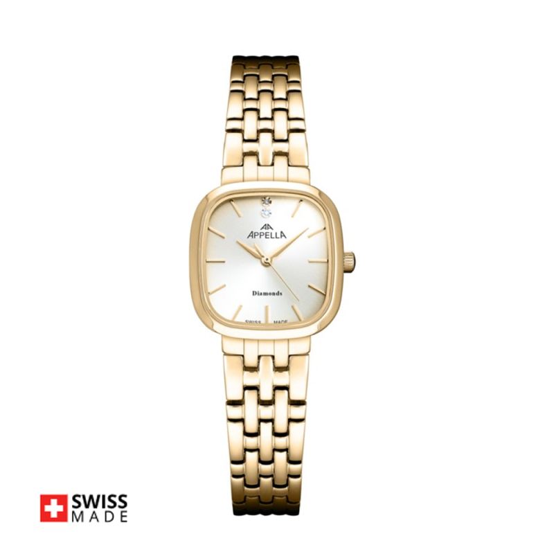Дамски часовник Appella L50030.1113DQ с класически дизайн. Корпус и верижка изработени от неръждаема стомана. Стъкло сапфир-кристал. Сребрист циферблат със златисти детайли и два нежни диаманта. Задвижва се от кварцов механизъм Ronda 753 Swiss Made. Водоустойчивост 3 ATM - допускат се леки пръски, не се препоръчва обилно мокрене.