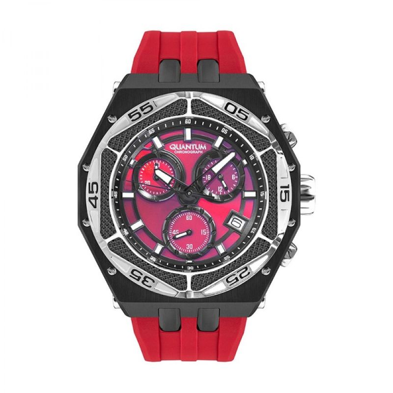 Мъжки часовник Quantum с интересен и модерен спортно-ежедневен дизайн от колекцията Hunter. Дисплей тип хронограф в червен цвят с черни детайли. Луминесцентно покритие върху стрелките и индексите. Стъкло минерал-кристал с антирефлексно покритие. Корпус от неръждаема стомана. Червена силиконова каишка. Задвижва се от кварцов механизъм с калибър VR34B14. Диаметър на корпуса 50 мм. Водоустойчивост 10 ATM - позволява мокрене, къпане и плуване във водни басейни.