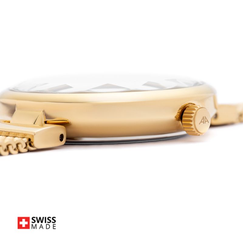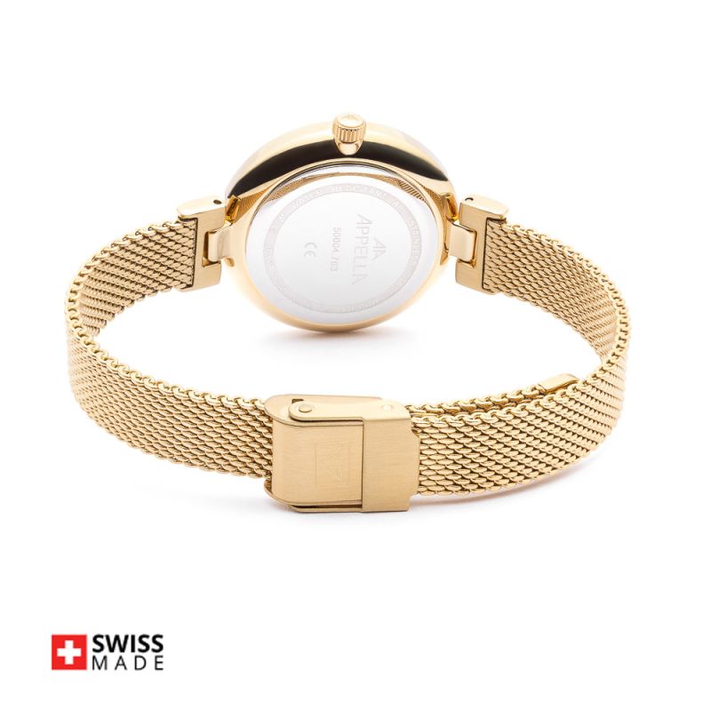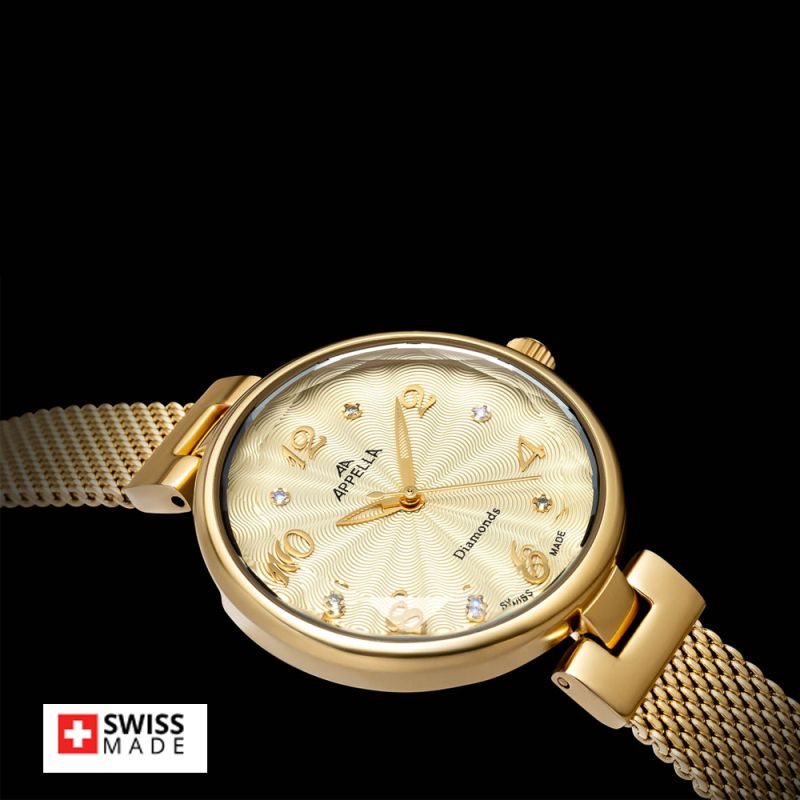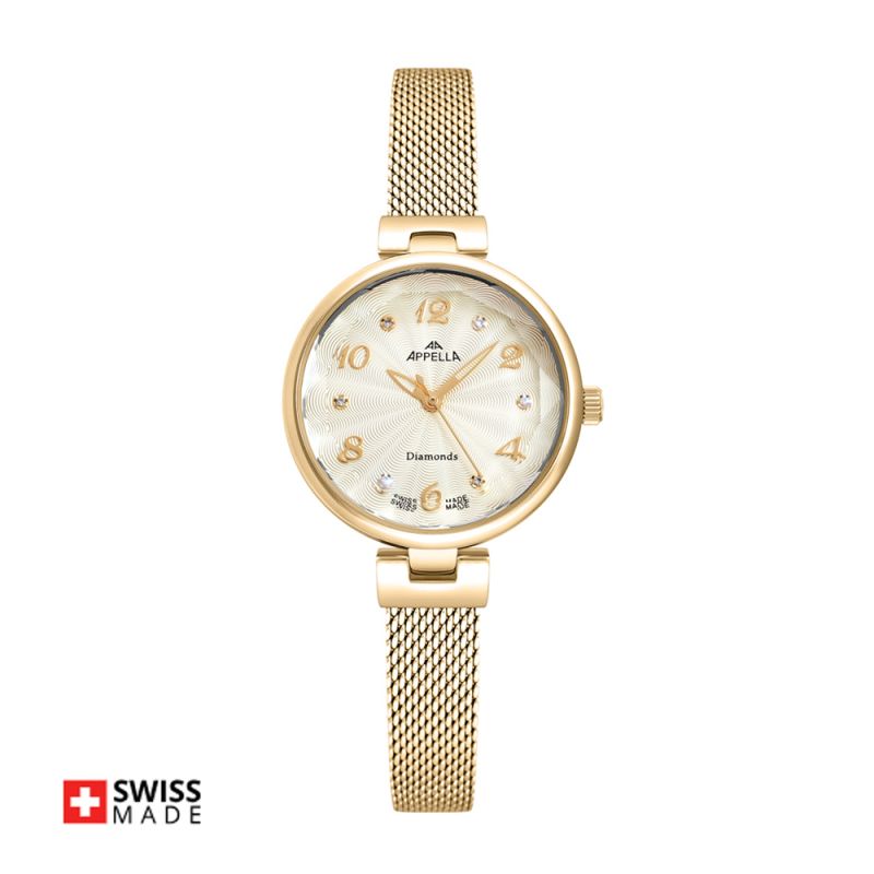 Стилен дамски часовник Appella L50004.1171DQ с нежен дизайн. Циферблат в златист цвят, украсен със 6 диаманта. Корпусът и тънка верижка изработени от неръждаема стомана. Стъкло минерал-кристал. Задвижва се от кварцов механизъм RONDA 763 Swiss Made. Диаметър на корпуса 30 мм. Водоустойчивост 3 ATM - допускат се леки пръски, не се препоръчва обилно мокрене.