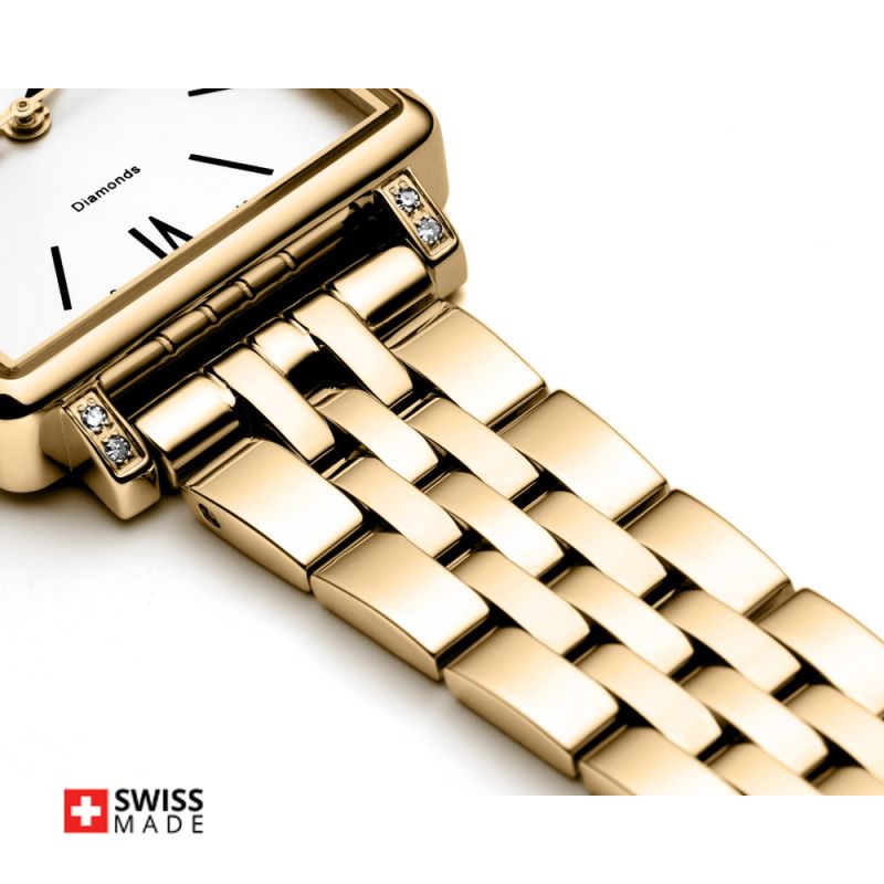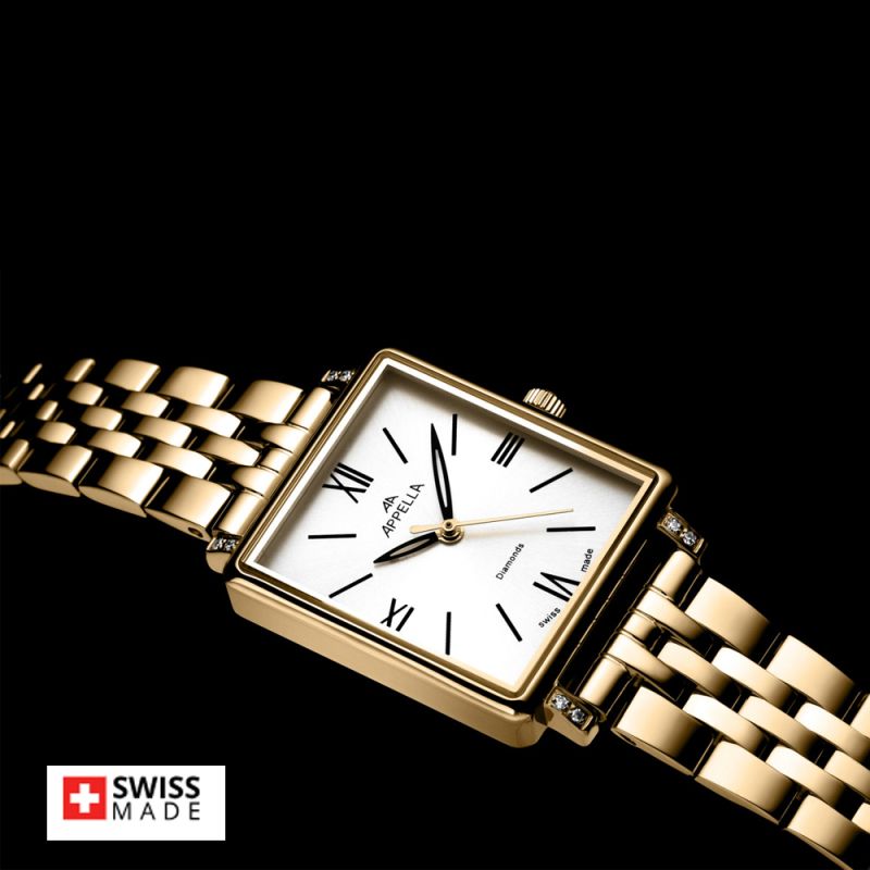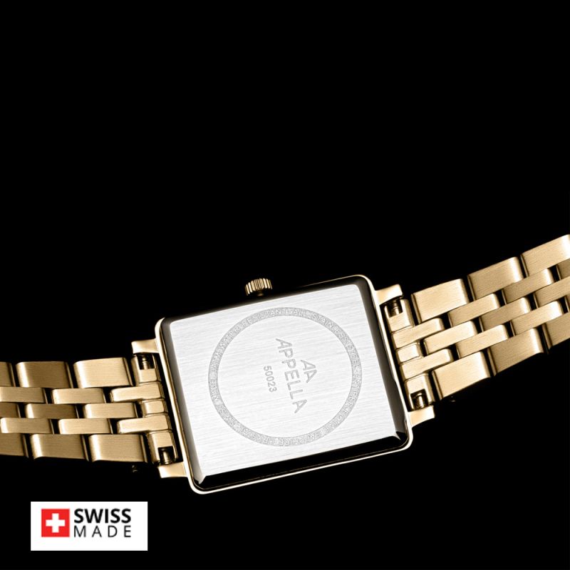 Дамски часовник Appella L50023.1163DQ привлича вниманието със своята елегантност. Корпус и верижка в златист цвят, изработени от неръждаема стомана. Корпусът е украсен с осем диаманта. Моделът е със сребрист циферблат и стъкло сапфир-кристал с антирефлетсно покритие. Задвижва се от кварцов механизъм ETA F04/ RONDA 785 Swiss Made. Водоустойчивост 3 ATM - допускат се леки пръски, не се препоръчва обилно мокрене.