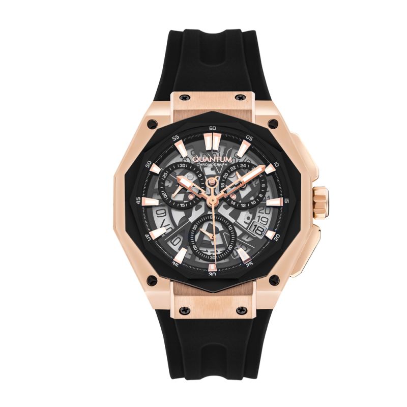 Спортен модел мъжки часовник Quantum от колекцията Hunter. Сив дисплей тип хронограф с детайли в цвят розово злато. Луминесцентно покритие върху стрелките и индексите. Стъкло минерал-кристал с антирефлексно покритие. Корпус от неръждаема стомана в комбинация със силиконова каишка. Задвижва се от кварцов механизъм. Диаметър на корпуса 47 мм. Водоустойчивост 10 ATM - позволява мокрене, къпане и плуване във водни басейни.