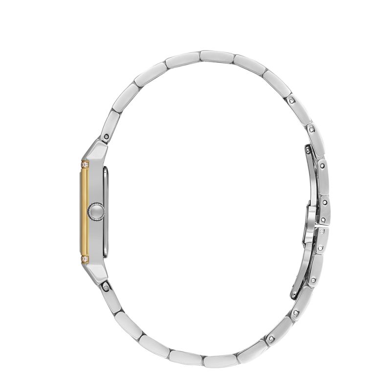 Стилен дамски часовник с нежен дизайн от колекцията Unique. Моделът е с красива декорация от кристали. Корпус и верижка изработени от неръждаема стомана. Сребрист аналагов дисплей със златисти детайли и сини стрелки. Стъкло минерал-кристал. Задвижва се от кварцов механизъм. Водоустойчивост 5 ATM - допускат се леки пръски и взимане на душ, не се препоръчва обилно мокрене.