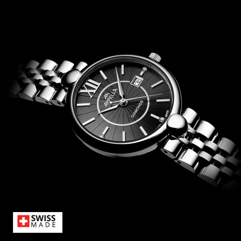 Елегантен дамски часовник Appella L50011.5166DQ. Корпус и верижка изработени от неръждаема стомана. Фин тъмносив циферблат с деликатни диамантени акценти. Моделът е с показател за дата. Стъкло сапфир-кристал с антирефлексно покритие. Задвижва се от кварцов механизъм ETA F04 Swiss Made. Диаметър на корпуса 31 мм. Водоустойчивост 3 ATM - допускат се леки пръски, не се препоръчва обилно мокрене.