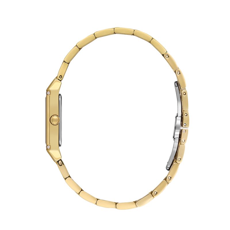 Стилен дамски часовник с нежен дизайн от колекцията Unique. Моделът е с красива декорация от кристали. Корпус и верижка изработени от неръждаема стомана. Сребрист аналагов дисплей със златисти детайли и сини стрелки. Стъкло минерал-кристал. Задвижва се от кварцов механизъм. Водоустойчивост 5 ATM - допускат се леки пръски и взимане на душ, не се препоръчва обилно мокрене.