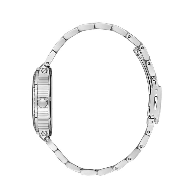 Стилен дамски часовник от колекцията Unique с декорация от инкрустирани кристали. Корпус и верижка от стомана. Аналогов дисплей в сребрист цвят с нежен дизайн. Стъкло минерал-кристал. Часовникът се задвижва от кварцов механизъм. Водоустойчивост 5 ATM - допускат се леки пръски и взимане на душ, не се препоръчва обилно мокрене.