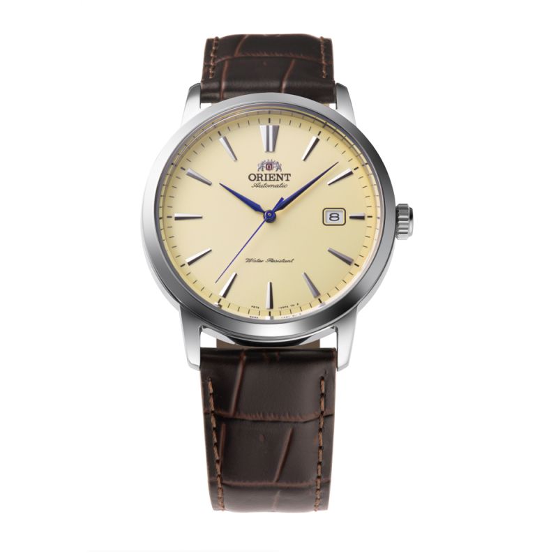 Класически модел мъжки часовник Orient със стилен дизайн от колекцията Contemporary. Корпус от неръждаема стомана. Кафява каишка от естествена кожа. Аналогов дисплей в бежов цвят с показател за дата. Сини стрелки и сребристи индекси. Стъкло минерал-кристал. Автоматичен механизъм Cal.F6722 с 22 камъка и 40 часа резервна мощност, който може да бъде наблюдаван през прозрачния гръб. Водоустойчивост 5 ATM - допускат се леки пръски и взимане на душ, не се препоръчва обилно мокрене.