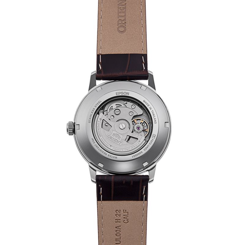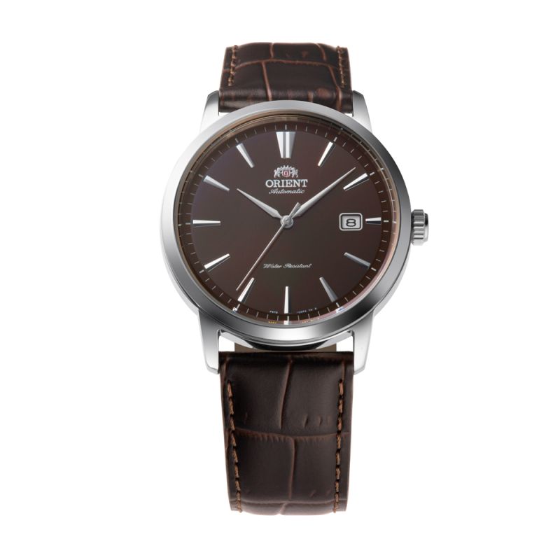 Класически модел мъжки часовник Orient със стилен дизайн от колекцията Contemporary. Корпус от неръждаема стомана.Каишка от естествена кожа. Аналогов дисплей в кафяв цвят с показател за дата. Сребристи стрелки и индекси. Стъкло минерал-кристал. Автоматичен механизъм Cal.F6722 с 22 камъка и 40 часа резервна мощност, който може да бъде наблюдаван през прозрачния гръб. Водоустойчивост 5 ATM - допускат се леки пръски и взимане на душ, не се препоръчва обилно мокрене.