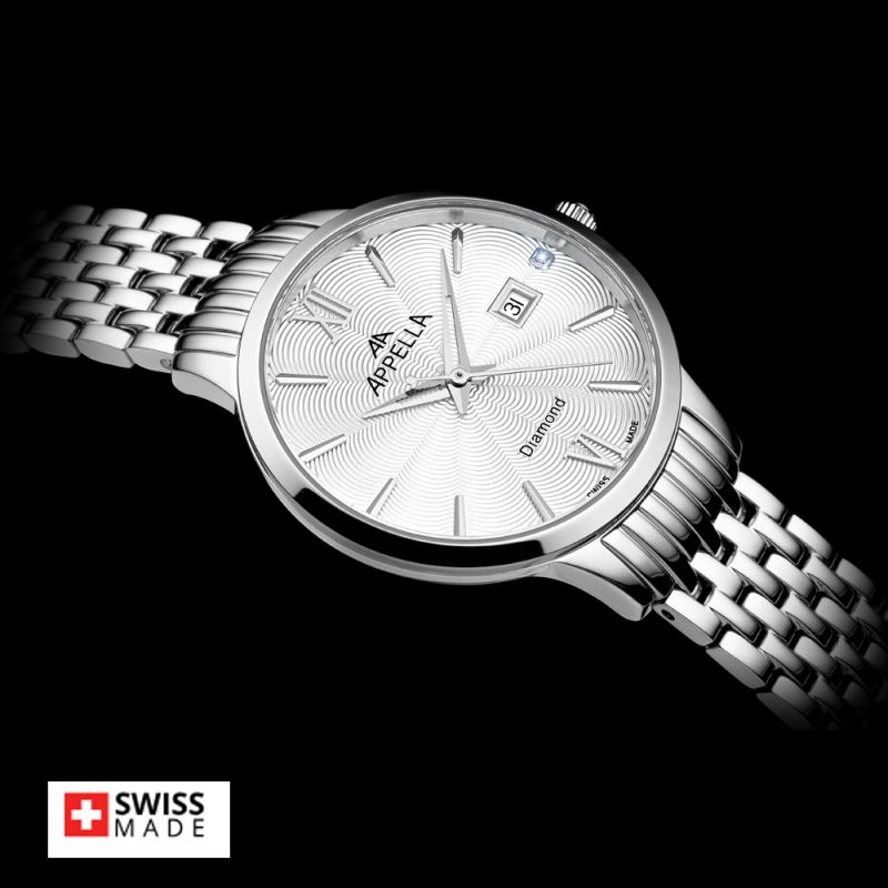 Стилен дамски часовник Appella L50012.5163DQ в сребрист цвят. Моделът е с корпус и верижка от неръждаема стомана. Стъклото е сапфир-кристал. Циферблатът е украсен с един диамант и допълнен с показател за дата. Часовникът се задвижва от кварцов механизъм RONDA 785 Swiss Made. Диаметър на корпуса 30 мм. Водоустойчивост 3 ATM - допускат се леки пръски, не се препоръчва обилно мокрене.