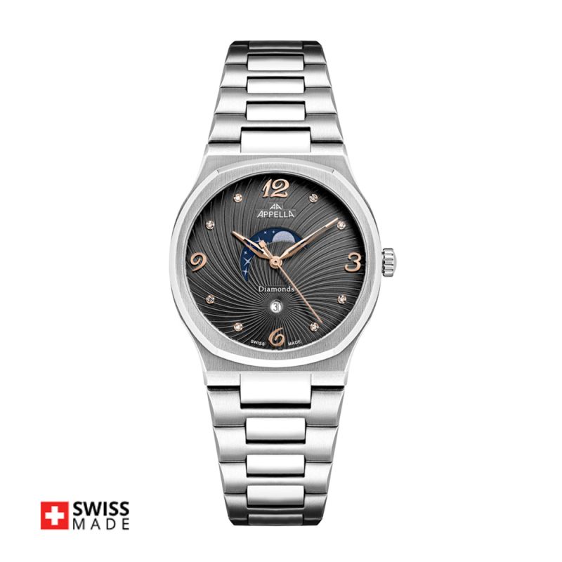 Appella L32006.51R6DQS е изключителен дамски часовник с елегантен тъмносивив циферблат, украсен с 8 диаманта, който красиво хармонизират със сребристия корпус и верижката от неръждаема стомана. Моделът е с показател за дата и лунна фаза. Стъклото е сапфир-кристал с антирефлексно покритие. Задвижва се от кварцов механизъм RONDA 788 Swiss Made. Диаметъра на корпуса е 33 мм. Водоустойчивост 5 ATM - допускат се леки пръски и взимане на душ, не се препоръчва обилно мокрене.