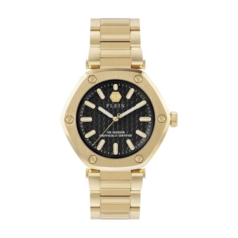 Стилен дамски часовник Philipp Plein с класическа визия от колекцията The Hexagon. Корпус и верижка изработени от неръждаема стомана. Черен аналогов дисплей със златисти детайли. Луминесцентно покритие върху стрелките и индексите. Стъкло минерал-кристал. Кварцов механизъм. Водоустойчивост 5 ATM - допускат се леки пръски и взимане на душ, не се препоръчва обилно мокрене.