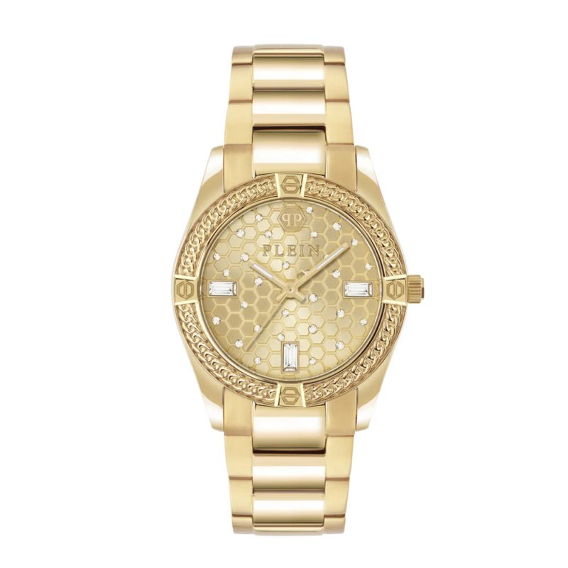 Дамски часовник Philipp Plein с нежна визия. Моделът е с корпус и верижка от неръждаема стомана и интересен дизайн тип плетка върху безела. Стъклото е минерал-кристал. Дисплеят е аналогов в златист цвят с декорация от кристали. Часовникът се задвижва от кварцов механизъм. Диаметър на корпуса 36 мм. Водоустойчивост 5 ATM - допускат се леки пръски и взимане на душ, не се препоръчва обилно мокрене.