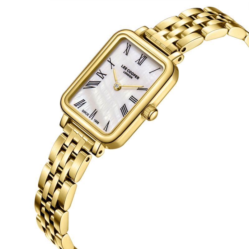 Класически модел дамски часовник Lee Cooper с изискана визия. Корпус изработен от супер метал. Верижка от неръждаема стомана. Аналогов дисплей в красив седефен цвят със златисти стрелки и черни римски цифри. Стъкло минерал-кристал. Задвижва се от кварцов механизъм. Водоустойчивост 3 ATM - допускат се леки пръски, не се препоръчва обилно мокрене.