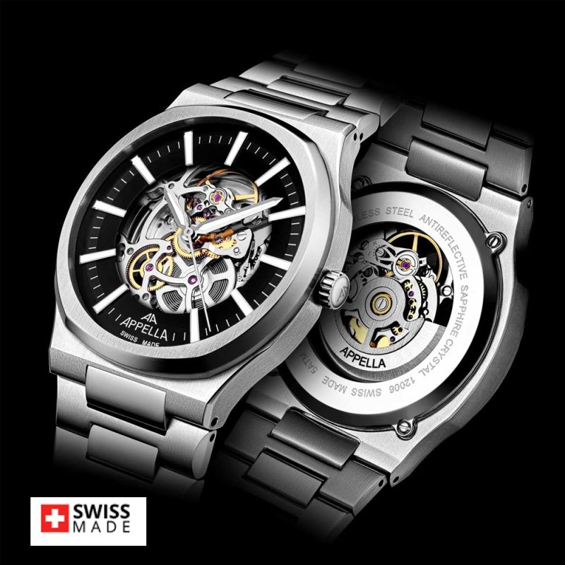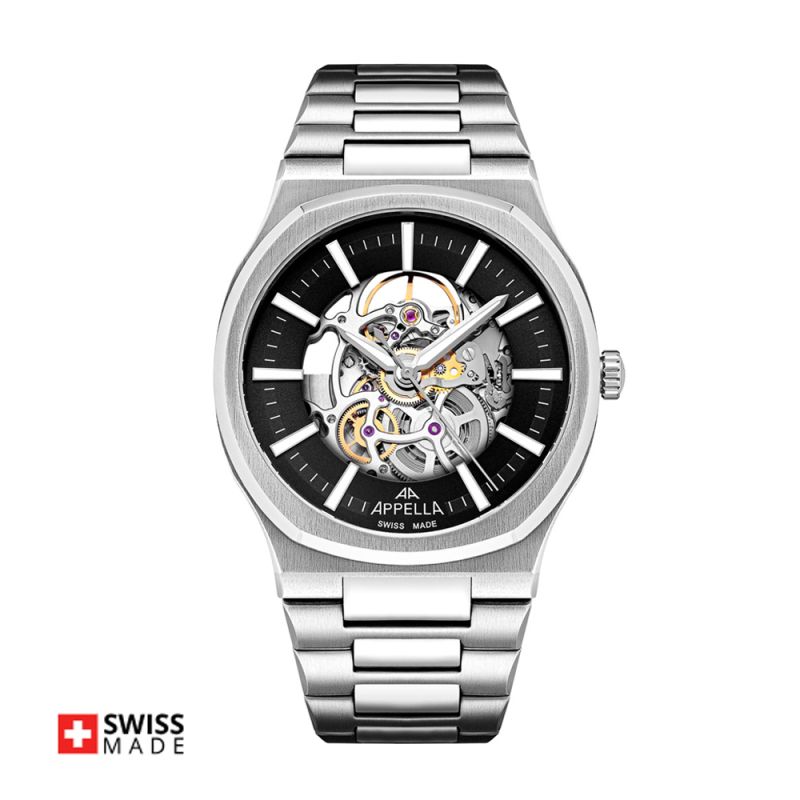 Мъжки часовник Appella L12006.5114ASQ впечатлява със своята уникална визия. Моделът е с корпус и верижка изработени от неръждаема стомана. Дисплеят е тип скелетон с модерен и стилен дизайн. Стрелките и индексите са с луминесцентно покритие. Стъклото е сапфир-кристал с антирефлексно покритие. Часовникът се задвижва от автоматичен механизъм SOPROD P024 Swiss Made. През прозрачния гръб на корпуса може да се наблюдава механизма на часовника. Диаметър на корпуса 42.5 мм. Водоустойчивост 5 ATM - допускат се леки пръски и взимане на душ, не се препоръчва обилно мокрене.