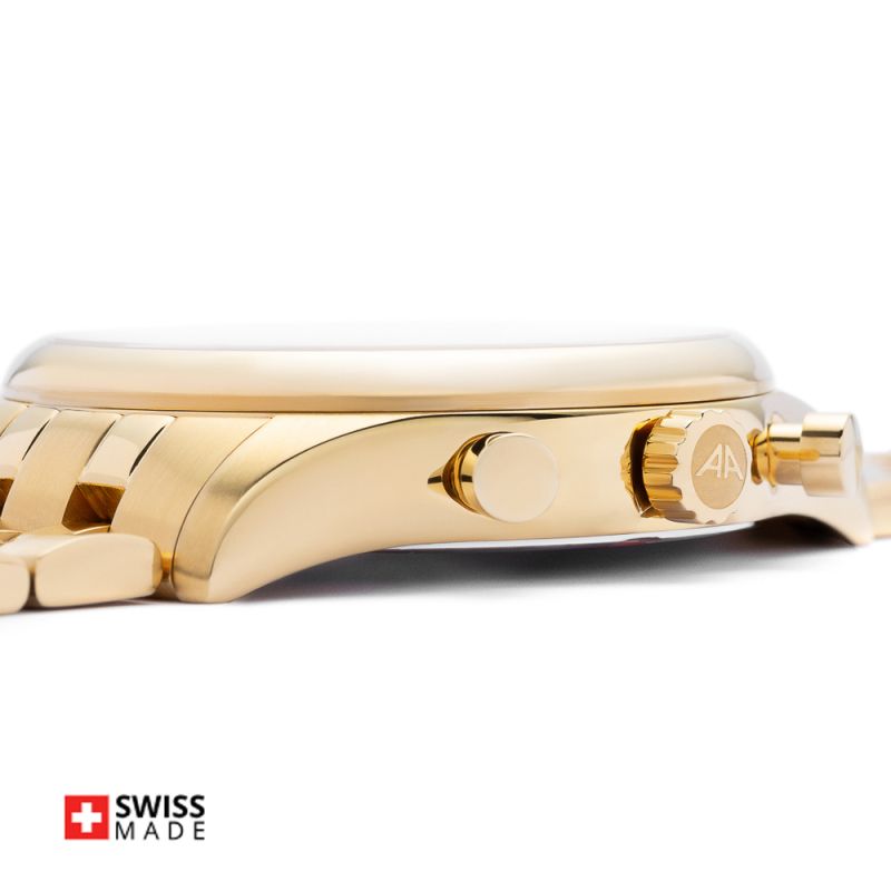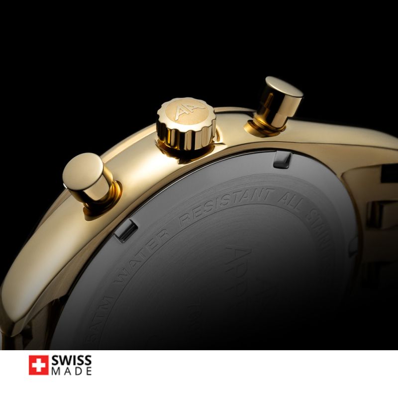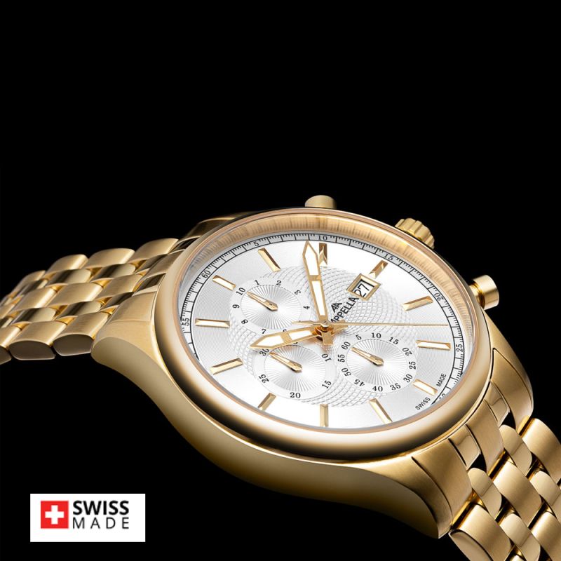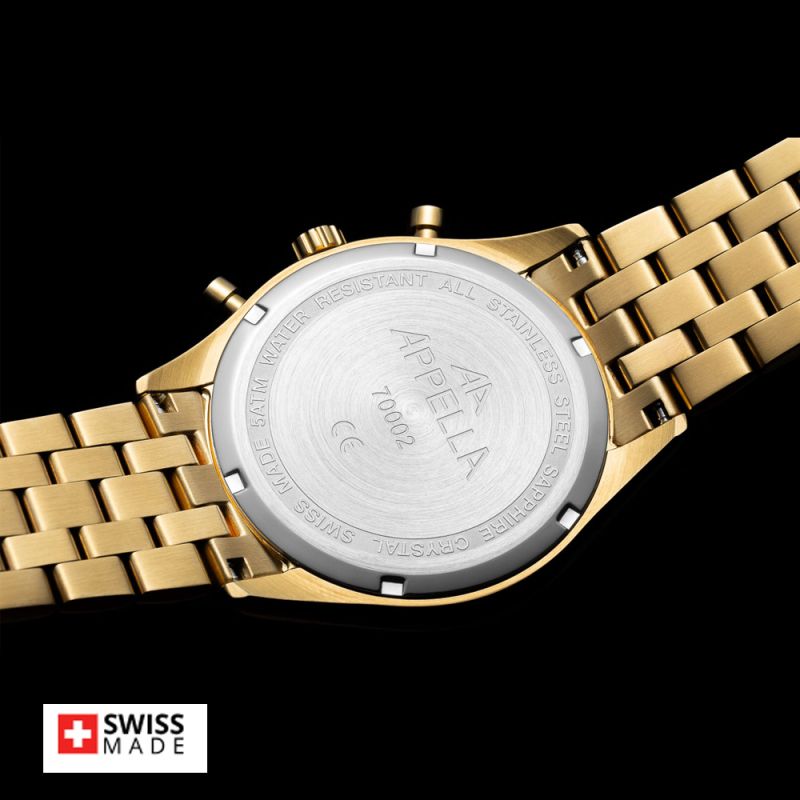 Стилен мъжки часовник Appella L70002.1113CH с корпус и верижка от неръждаема стомана. Сребрист дисплeй хронограф със златисти детайли. Стъкло сапфир-кристал. Задвижва се от кварцов механизъм RONDA 3540D Swiss Made. Диаметър на корпуса 43 мм. Водоустойчивост 5 ATM - допускат се леки пръски и взимане на душ, не се препоръчва обилно мокрене.