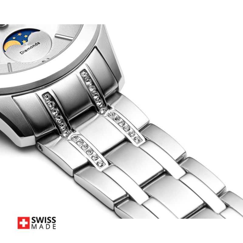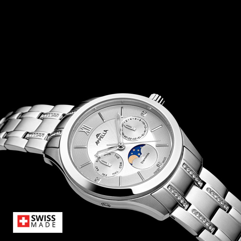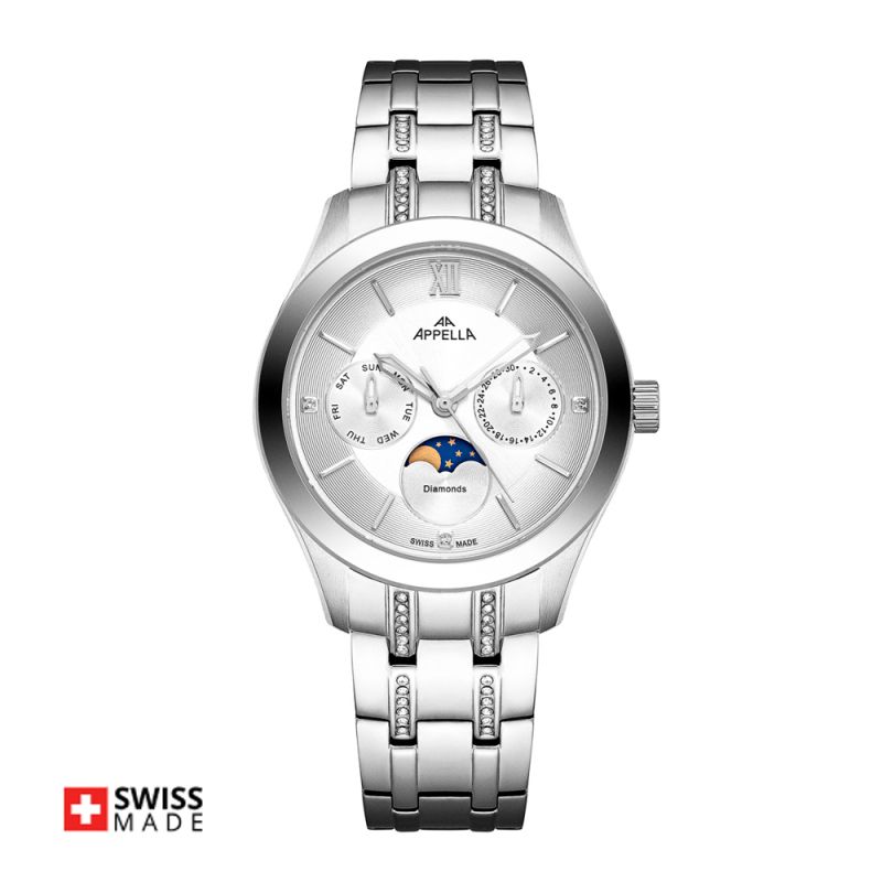 Appella L50021.5163DQF е дамски часовник, който се отличава с елегантен сребрист корпус и циферблат, украсен с три диаманта. Стъклото е сапфир-кристал с антирефлексно покритие. Корпусът и верижката са изработени от неръждаема стомана. Верижката е декорирана с нежни кристали. Мултифункционалният дисплей е с показатели за дата, ден от седмицата и лунна фаза. Задвижва се от кварцов механизъм RONDA 706 Swiss Made. Диаметър на корпуса 36 мм. Водоустойчивост 3 ATM - допускат се леки пръски, не се препоръчва обилно мокрене.