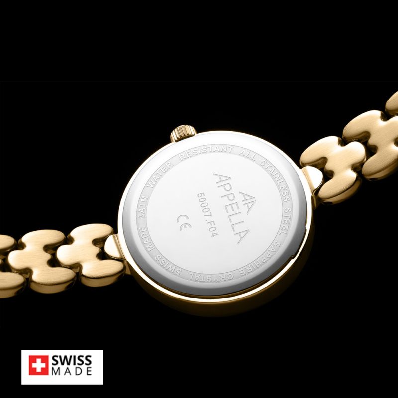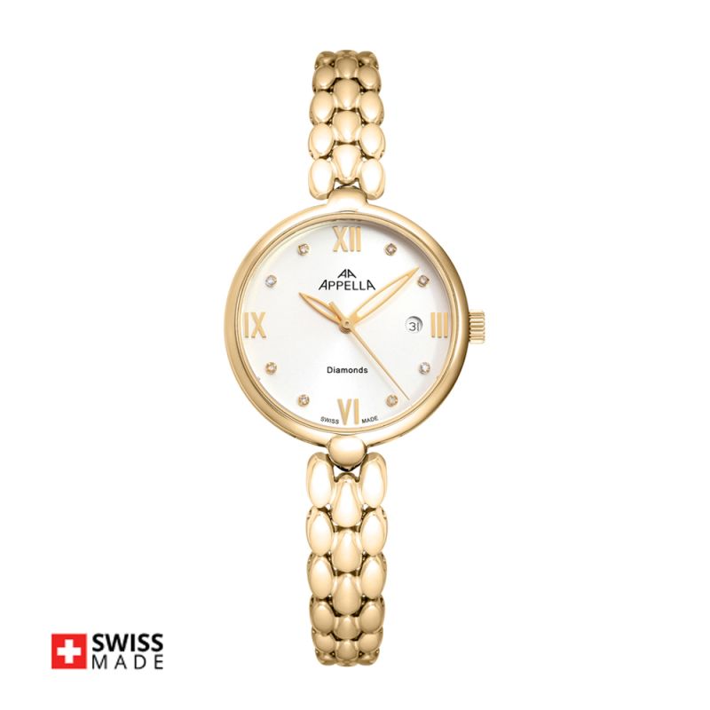 Стилен дамски часовник Appella L50007.1183DQ с нежен дизайн. Моделът е с корпус и верижка изработени от неръждаема стомана. Циферблата е украсен с осем красиви диаманта и допълнен с показател за дата. Стъклото е сапфир-кристал. Задвижва се от кварцов механизъм ETA F04 Swiss Made. Диаметър на корпуса 28 мм. Водоустойчивост 3 ATM - допускат се леки пръски, не се препоръчва обилно мокрене.
