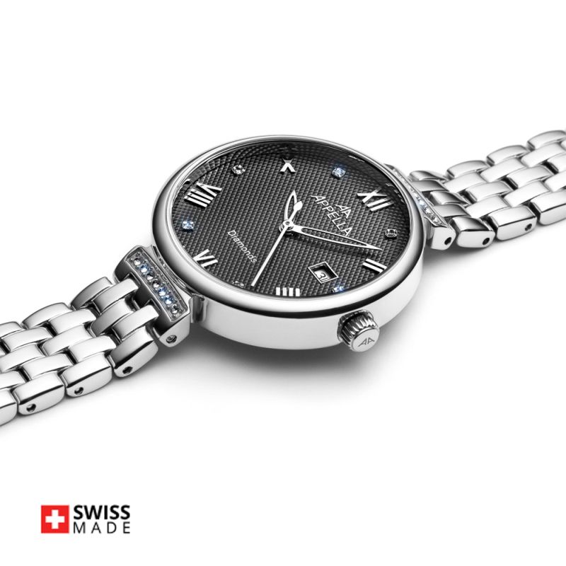 Дамски часовник Appella L50006.5187DQ с елегантна визия. Тъмносив циферблат, декориран със шест нежни диаманта и допълнен с индикатор за дата. Корпус от неръждаема стомана. Сребриста стоманена верижка украсена с кристали. Стъкло сапфир-кристал. Задвижва се от кварцов механизъм ETA F04 Swiss Made. Диаметър на корпуса 30 мм. Водоустойчивост 3 ATM - допускат се леки пръски, не се препоръчва обилно мокрене.
