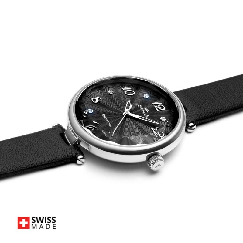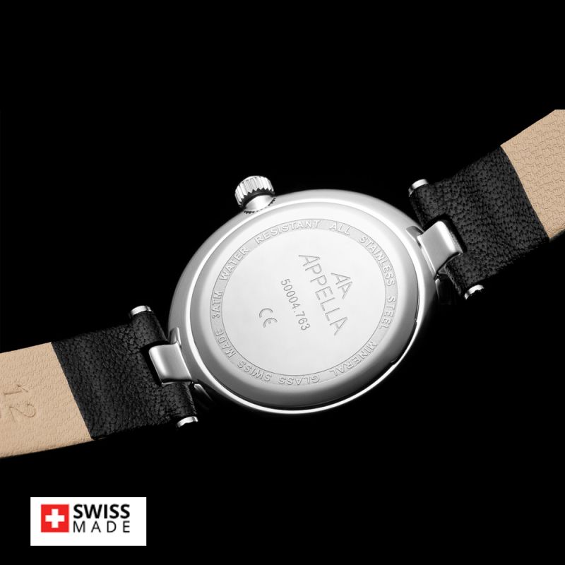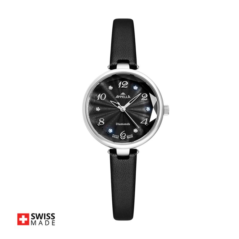 Дамски часовник Appella L50004.5274DQ със стилен дизайн. Циферблат в черен цвят, декориран със шест нежни диаманта. Корпус от неръждаема стомана, съчетан с кожена каишка. Стъкло минерал-кристал. Задвижва се от кварцов механизъм RONDA 763 Swiss Made. Диаметър на корпуса 30 мм. Водоустойчивост 3 ATM - допускат се леки пръски, не се препоръчва обилно мокрене.