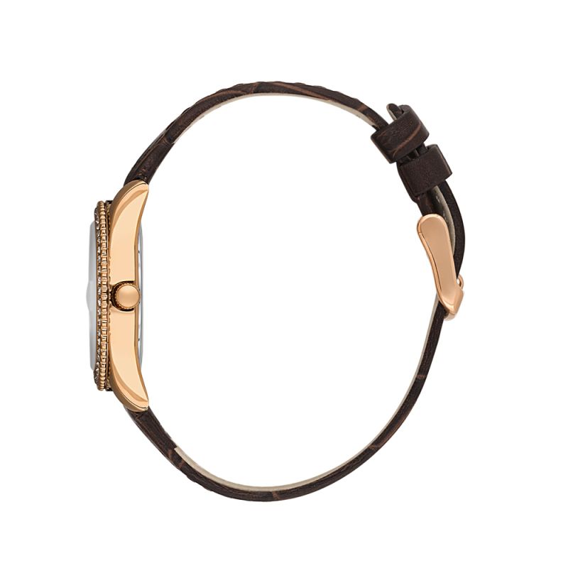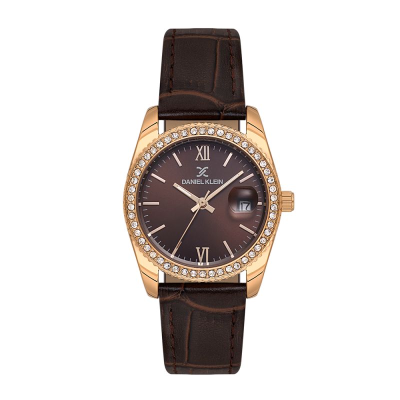 Стилен дамски часовник Daniel Klein с красив дизайн от колекцията Premium. Аналогов дисплей с показател за дата. Декорация от нежни кристали по безела. Метален корпус. Диаметър на корпуса 37.5 мм. Каишка от естествена кожа в кафяв цвят. Стъкло минерал-кристал. Задвижва се от кварцов механизъм VX12E11. Водоустойчивост 3 ATM - допускат се леки пръски, не се препоръчва обилно мокрене.