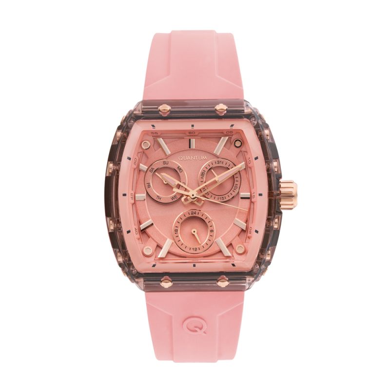 Дамски часовник Quantum с модерна спортна визия в нежен розов цвят. Мултифункционален дисплей с показатели за дата, ден от седмицата и 24-часов формат. Стъкло минерал-кристал. Моделът е с корпус от полимер и силиконова каишка. Часовникът се задвижва от кварцов механизъм. Водоустойчивост 5 ATM - допускат се леки пръски и взимане на душ, не се препоръчва обилно мокрене.