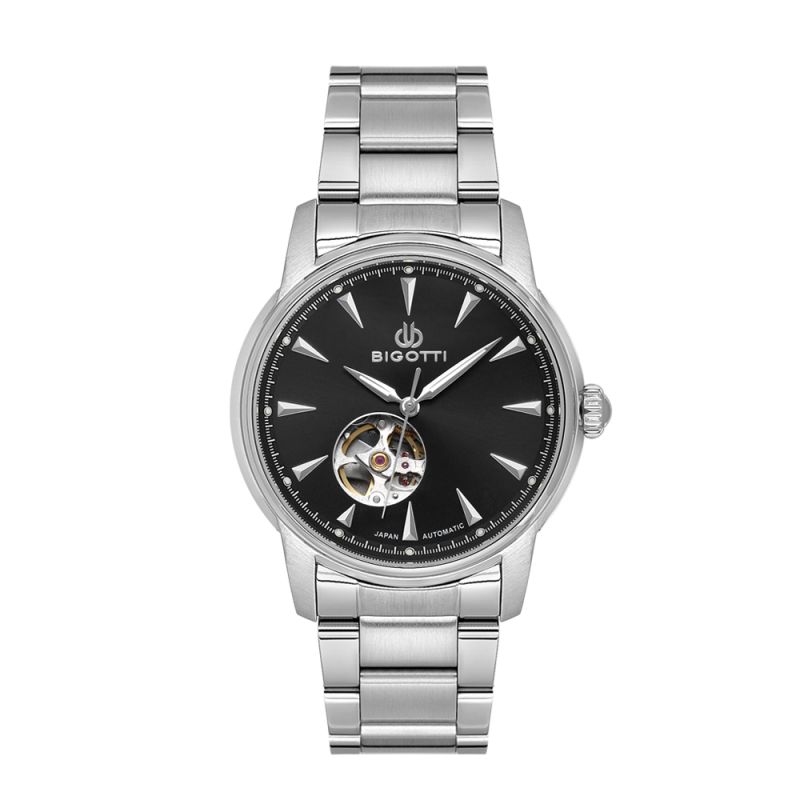 Мъжки часовник Bigotti със стилен дизайн от колекцията Raffinato. Дисплеят е аналогов в черен цвят със сребристи детайли и видим механизъм. Стъклото е минерал-кристал. Корпусът е изработен от месинг. Верижката е от неръждаема стомана. Часовникът се задвижва от автоматичен механизъм 82S0. Диаметър на корпус 42 мм с ширина на верижка 22 мм х 20 мм. Водоустойчивост 5 ATM - допускат се леки пръски и взимане на душ, не се препоръчва обилно мокрене.