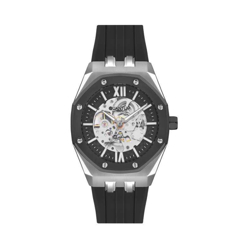 Мъжки часовник Quantum с впечатляващ дизайн от колекцията Q-Master. Дисплеят на модела е скелетон с луминесцентно покритие на стрелките и индексите. Стъклото е минерал-кристал с антирефлексно покритие. Корпусът е изработен от неръждаема стомана и е съчетан със силиконова каишка. Задвижва се от автоматичен механизъм с калибър 82S0. Водоустойчивост 10 ATM - позволява мокрене, къпане и плуване във водни басейни.