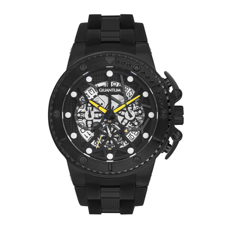 Страхотен модел мъжки часовник Quantum от колекцията Hunter. Дисплей комбинация от хронограф и скелетон с впечатляващ дизайн. Луминесцентно покритие върху стрелките и индексите. Стъкло минерал-кристал с антирефлексно покритие. Корпус от неръждаема стомана в комбинация със силиконова каишка. Часовникът се задвижва от кварцов механизъм с калибър VR33. Диаметър  на корпуса 51 мм. Водоустойчивост 10 ATM - позволява мокрене, къпане и плуване във водни басейни.