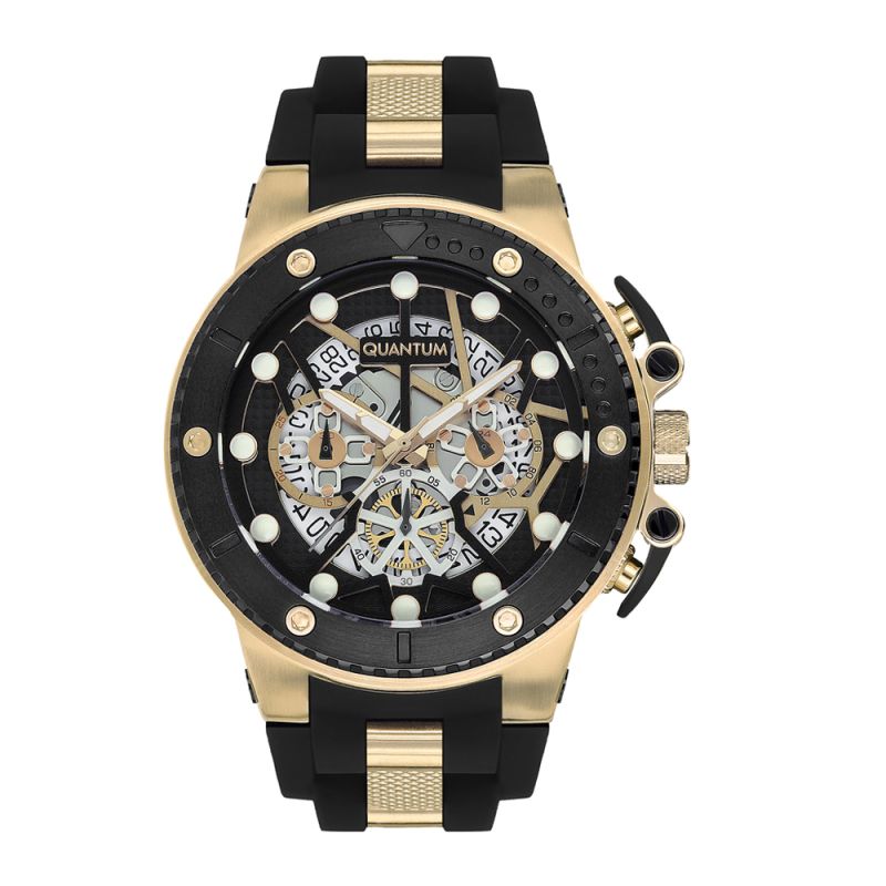 Страхотен модел мъжки часовник Quantum от колекцията Hunter. Дисплей комбинация от хронограф и скелетон с впечатляващ дизайн. Луминесцентно покритие върху стрелките и индексите. Стъкло минерал-кристал с антирефлексно покритие. Корпус изработен от неръждаема стомана. Силиконова каишка в черен цвят със златисти детайли. Диаметър на корпуса 50 мм. Часовникът се задвижва от кварцов механизъм. Водоустойчивост 10 ATM - позволява мокрене, къпане и плуване във водни басейни.