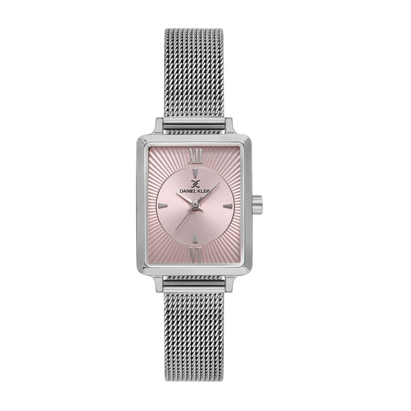 Елегантен дамски часовник Daniel Klein от колекцията Premium. Аналогов дисплей в розов цвят със сребристи детайли. Метален корпус. Меш верижка от неръждаема стомана. Стъкло минерал-кристал. Задвижва се от кварцов механизъм Y121F1. Водоустойчивост 3 ATM - допускат се леки пръски, не се препоръчва обилно мокрене.