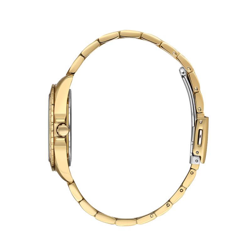 Дамски часовник Daniel Klein от колекцията Exclusive. Моделът е с богата декорация от инкрустирани кристали по безела и дисплея. Дисплеят е мултифункционален с показатели за дата, ден от седмицата и 24 часов формат. Корпусът е метален в комбинация с верижка от неръждаема стомана. Диаметър на корпуса 42.5 мм. Стъклото е минерал-кристал. Задвижва се от кварцов механизъм VX3JE1. Водоустойчивост 3 ATM - допускат се леки пръски, не се препоръчва обилно мокрене.