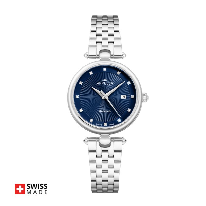 Елегантен дамски часовник AppellaL L50002.5145DQ с нежен дизайн. Циферблат в син цвят, украсен с 12 диаманта и допълнен с индикатор за дата. Корпусът и верижката са изработени от неръждаема стомана. Стъклото е сапфир-кристал. Задвижва се от кварцов механизъм ETA F04 Swiss Made. Диаметър на корпуса 31 мм. Водоустойчивост 3 ATM - допускат се леки пръски, не се препоръчва обилно мокрене.