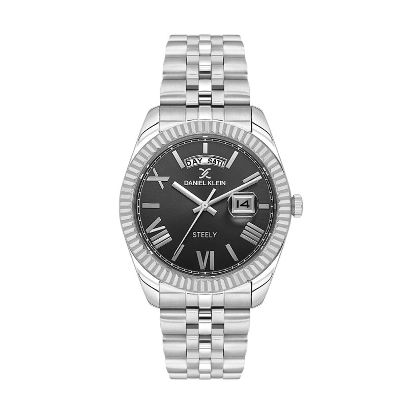 Спортно-елегантен мъжки часовник Daniel Klein от колекцията Steely. Моделът е с корпус и верижка от неръждаема стомана. Черен аналогов дисплей с показатели за дата и ден от седмицата. Стъкло минерал-кристал. Диаметър на корпуса 49 мм. Часовникът се задвижва от кварцов механизъм VX44E11W. Водоустойчивост 5 ATM - допускат се леки пръски и взимане на душ, не се препоръчва обилно мокрене.